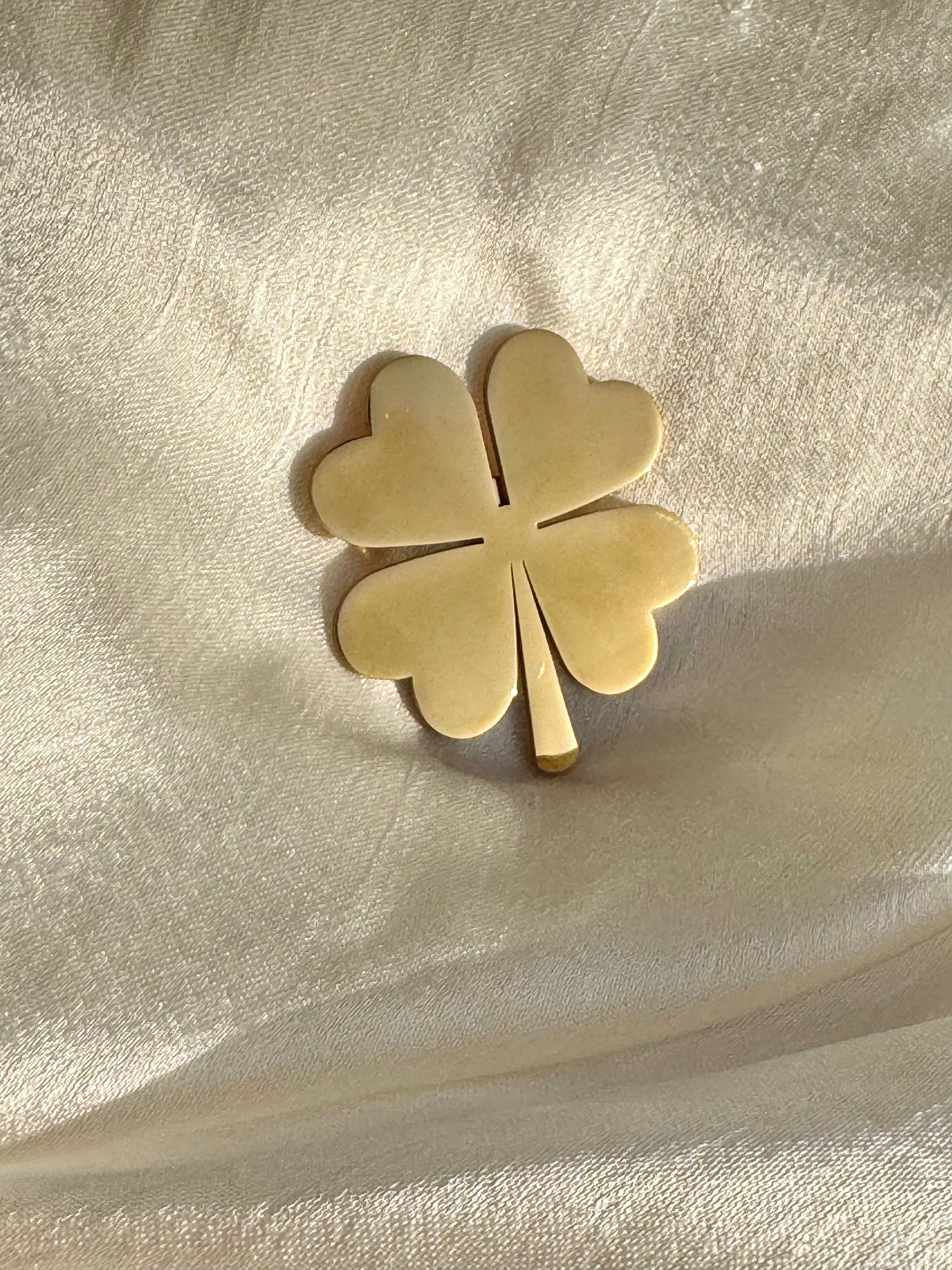 Elevate your confidence with a touch of destiny. This elegant brooch features the iconic four-leaf clover in a smooth, creamy golden finish. It’s the small, powerful detail that brings timeless sophistication and good fortune to any outfit. Pin it on your blazer, secure a scarf, or define a neckline. The essential piece for the woman who knows detail matters.