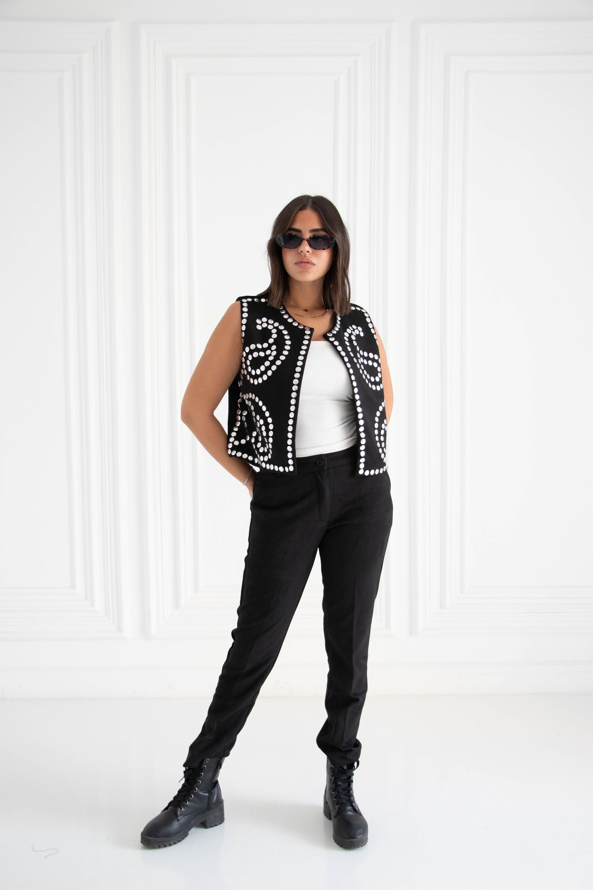 Featuring elegant embroidery that blends timeless design with modern edge. Its refined details and flattering cut make it the perfect piece to elevate any casual or chic outfit.