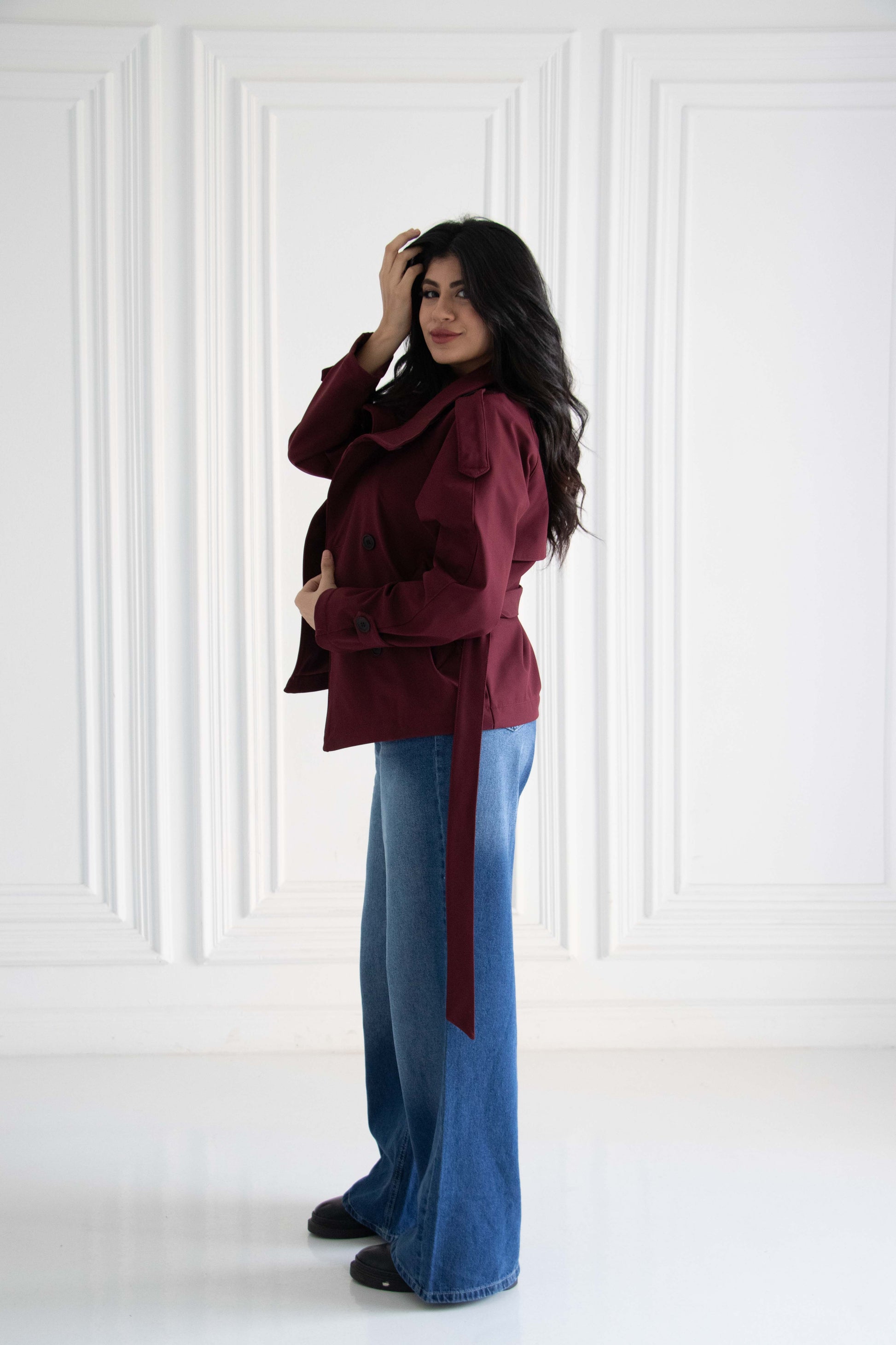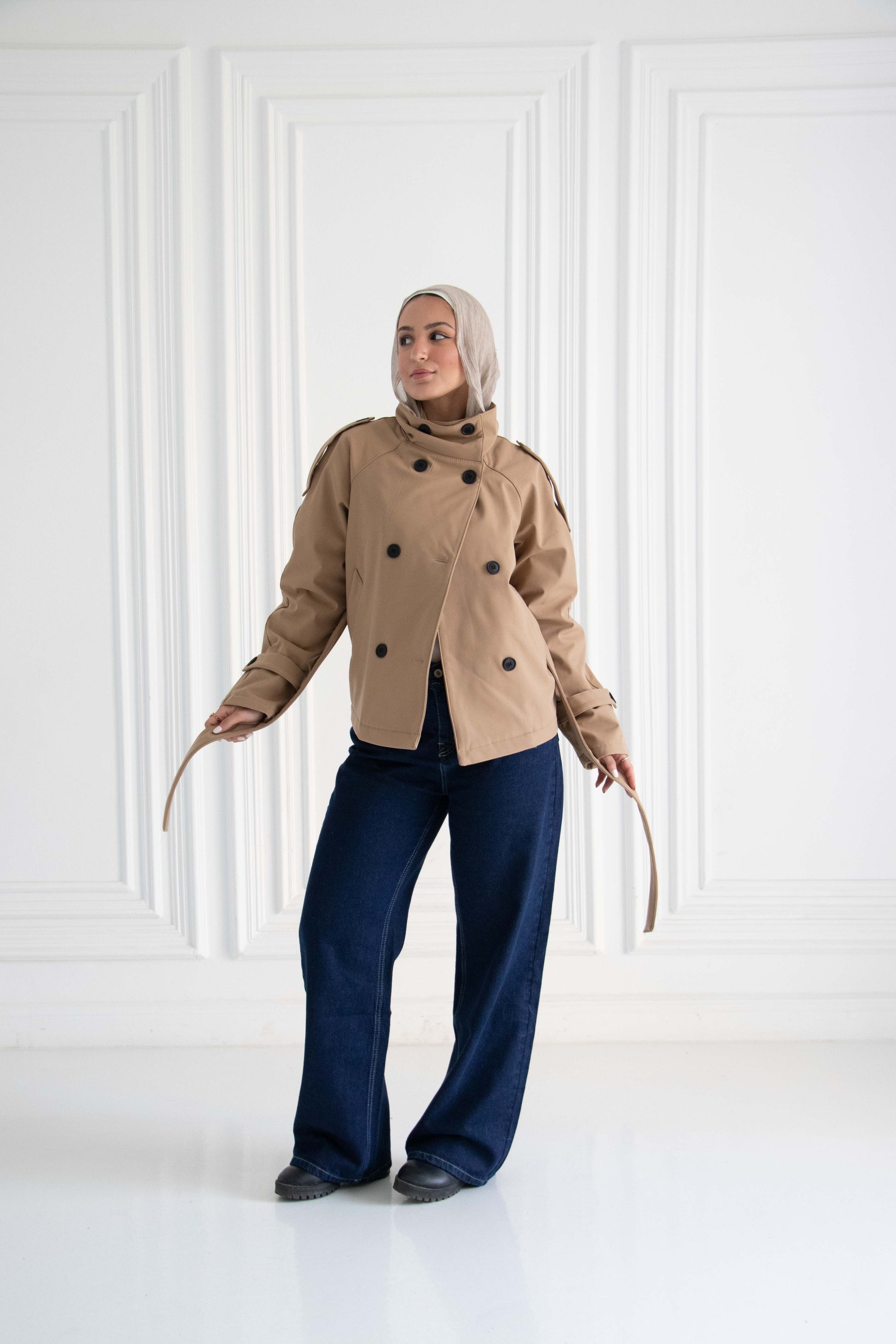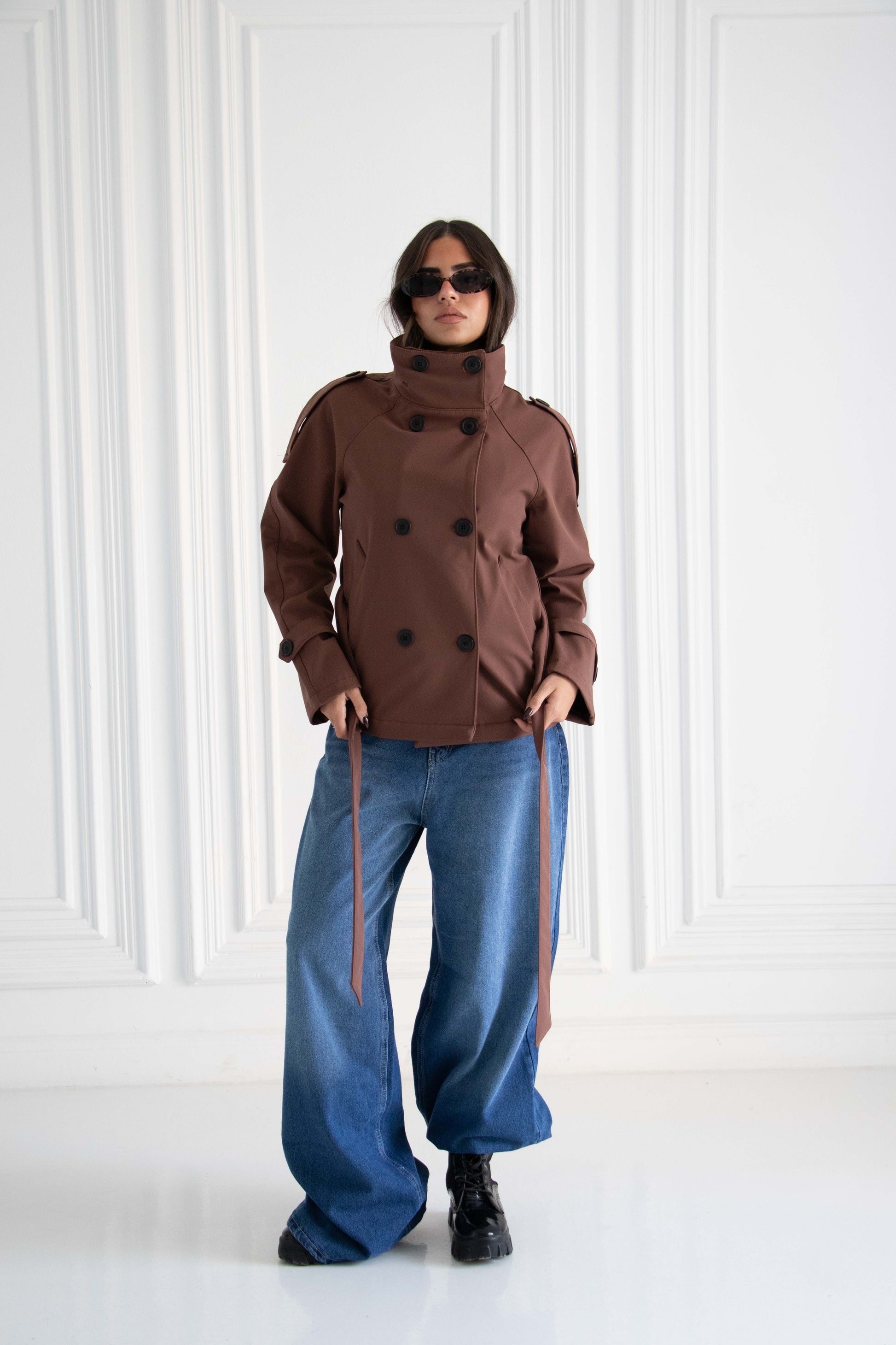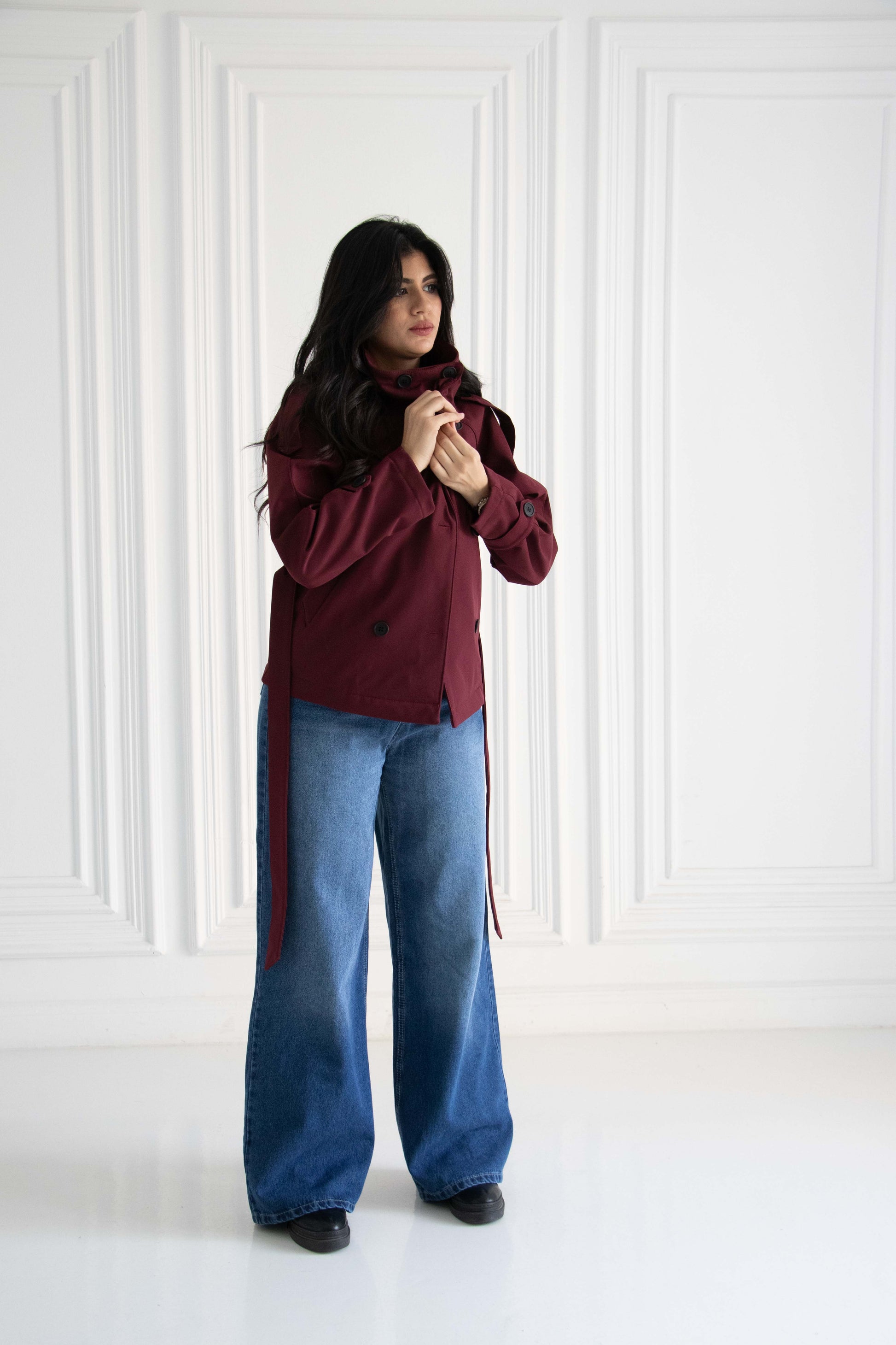 Designed with a bold high-rise collar, double-breasted button detailing, and adjustable cuffs for that perfect tailored finish. The integrated waist tie cinches your shape, ensuring a flattering and commanding fit.